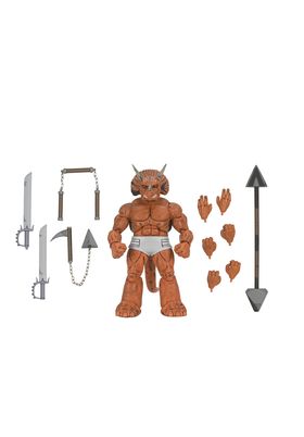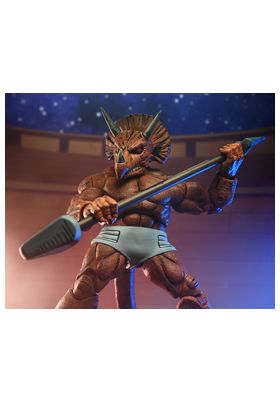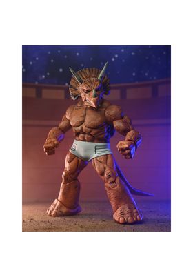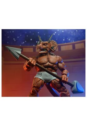 Neca presenta, dentro de la colección Scale Action Figure, la figura de Triceraton Gladiator. Mide 18 cm y está basada en el personaje de los cómics "Teenage Mutant Ninja Turtles" de Mirage Comics. Cuenta con múltiples puntos de articulación, incluyendo la cola que contiene un alambre para posar. Contiene 3x pares de manos extras y arsenal de armas. Se presenta en una caja con ventana con ilustraciones originales de Kevin Eastman.