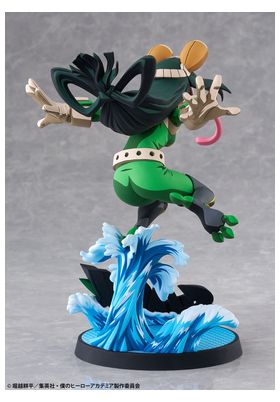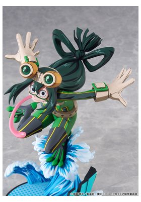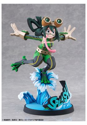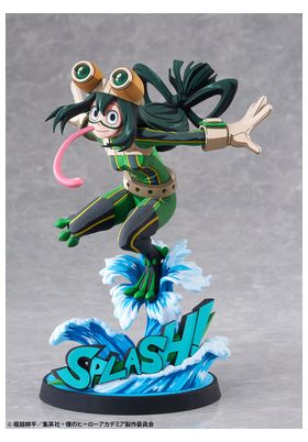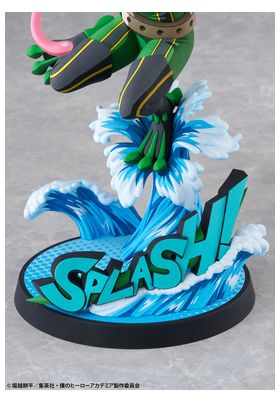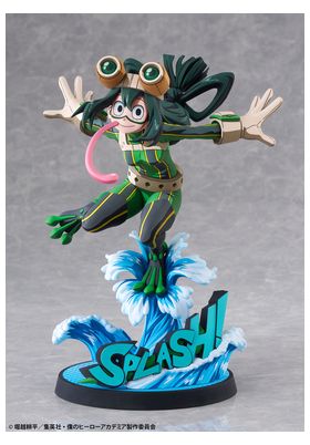 BellFine presenta esta estatua a escala 1/8 de Tsuyu Asui con su traje de superheroína, basada en su apariencia en el anime "My Hero Academia". Esta versión cuenta con un estilo gráfico peculiar que pretende reproducir la bidimensionalidad de su aspecto en pantalla. La figura mide aproximadamente 20 cm y está fabricada en ABS y PVC. Su base circular, esta decorada con olas y la palabra Splash! sobre ellas.