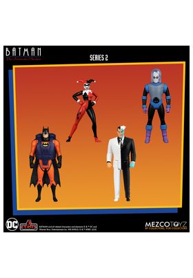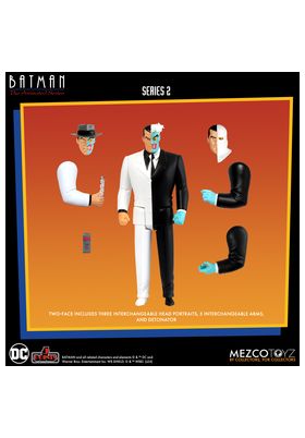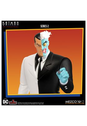 Mezco Toyz presenta, dentro de la colección 5 Points, la figura de Two-Face. Mide 9,5 cm y está basada en el personaje de la serie de animación de los 90 "Batman". Contiene 2x cabezas alternativas, 3x brazos extras y 1x detonador. Puedes exponerla junto a las figuras de Sky Dive Batman: The Animated Series". Harley Quinn, Mr. Freeze y Batman con su Batcycle (se venden por separado).