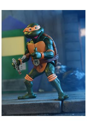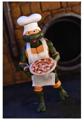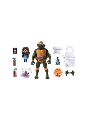 Neca presenta, dentro de la colección Sclae Action, la figura de Ultimate Michelangelo. Mide 18 cm y está basada en el personaje de la serie "Teenage Mutant Ninja Turtles". Contiene 1x gorro de cocinero, 1x delantal, 1x par de manos, 1x pizza, 2x nunchakus, 1x cinta VHS, 1x mini dragón, 1x pez en su pecera y 1x compañero del Pizza Club. Se presenta en una caja con ventana con estilo VHS del Pizza Club. UNIDADES LIMITADAS.