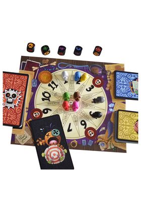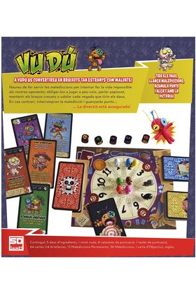 Components: 5 daus d ingredients, 1 ninot vudú, 8 calaveres de puntuació, 1 tauler de puntuació, 64 cartes (14 Artefactes, 13 Malediccions Permanents, 36 Malediccions, 1 carta d Objectiu), 1 reglament.