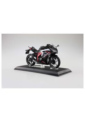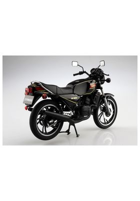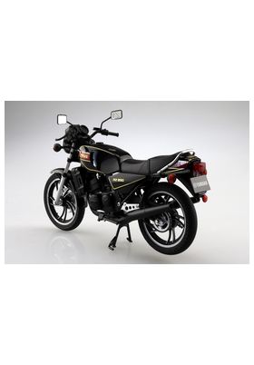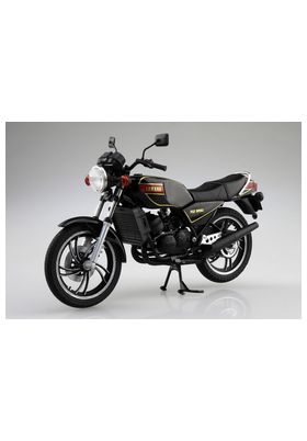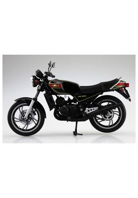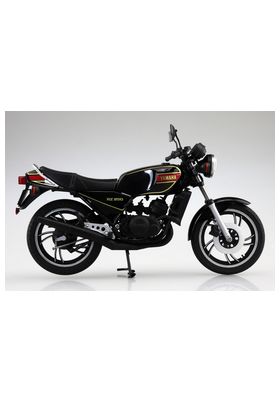 Aoshima Bunka Kyozai Co presenta la Yamaha RZ250 New Yamaha Black Version. La motocicleta lanzada en 1980, tiene una longitud de 17,5 cm a una escala de 1/12. El volante y la suspensión trasera son móviles. El depósito y el bastidor son de fundición inyectada. El neumático está hecho de caucho.